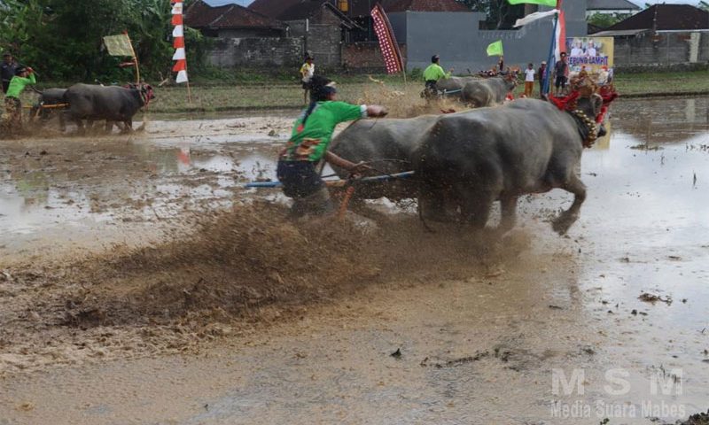 “Kegiatan ini diikuti oleh 40 pasang kerbau dari blok barat maupun blok timur, yang merupakan kegiatan tradisional turun temurun petani setelah panen, khusus ada di Kabupaten Jembrana,” jelas Gede Mare.