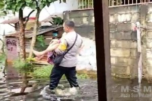 Bhabinkamtibmas Evakuasi Nenek Lumpuh Korban Banjir di Singkawang Tengah