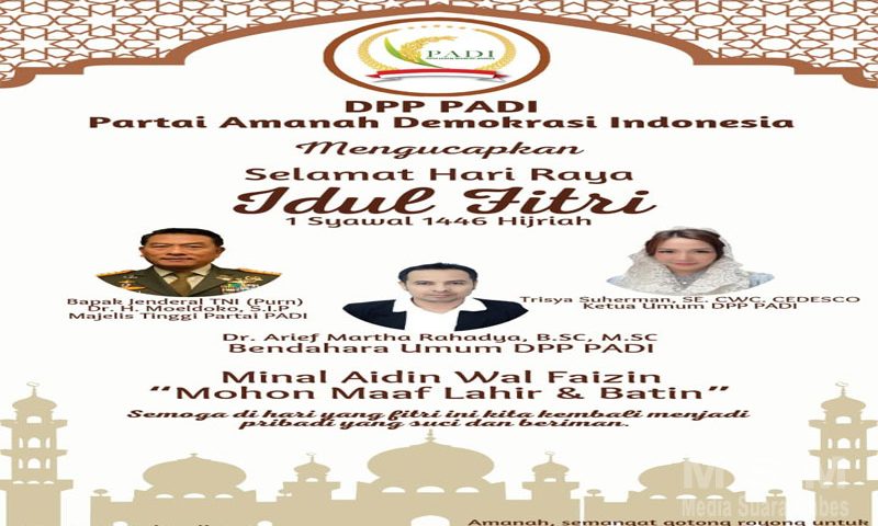 Ketua Umum Partai PADI,Trisya Suherman mengatakan,di momen yang penuh berkah ini, saya mengucapkan selamat merayakan Idul Fitri bagi Sahabat Muslimku yg merayakan dan Seluruh Dewan Pembina, Dewan Pengawas, DPP, DPD, Anggota & Para Pendiri Organisasi yang saya pimpin : Partai PADI, Perkumpulan Moeldoko Center, Perkumpulan Pengusaha Bela Bangsa, Perkumpulan Milenial Cinta Budaya, Yayasan Global CEO Indonesia, Yayasan Perempuan Bersinar (Bersih Narkoba) juga seluruh Mitra Kerja, Karyawan, Relasi semua,”tutupnya