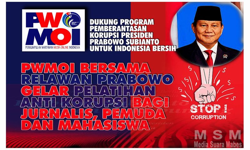 MediaSuaraMabes, Jakarta — PWMOI (Perkumpulan Wartawan Media Online Indonesia) gandeng Relawan Prabowo gelar pelatihan anti korupsi bagi jurnalis, pemuda dan mahasiswa guna mendukung komitmen Presiden Prabowo dalam memberantas korupsi di Bumi Nusantara