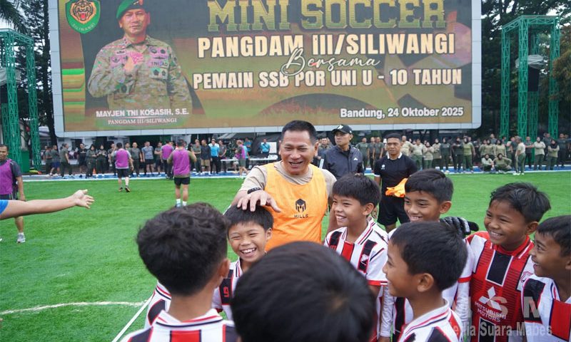 MediaSuaraMabes, Bandung – Kodam III/Siliwangi menggelar pertandingan mini soccer persahabatan antara Pangdam III/Siliwangi Mayjen TNI Kosasih, S.E., bersama jajaran pejabat Kodam III/Siliwangi melawan tim SSB POR UNI U-10, di Lapangan Prajurit Kodam III/Siliwangi, Jalan Aceh No. 69, Kota Bandung, Jumat (24/10/2025).