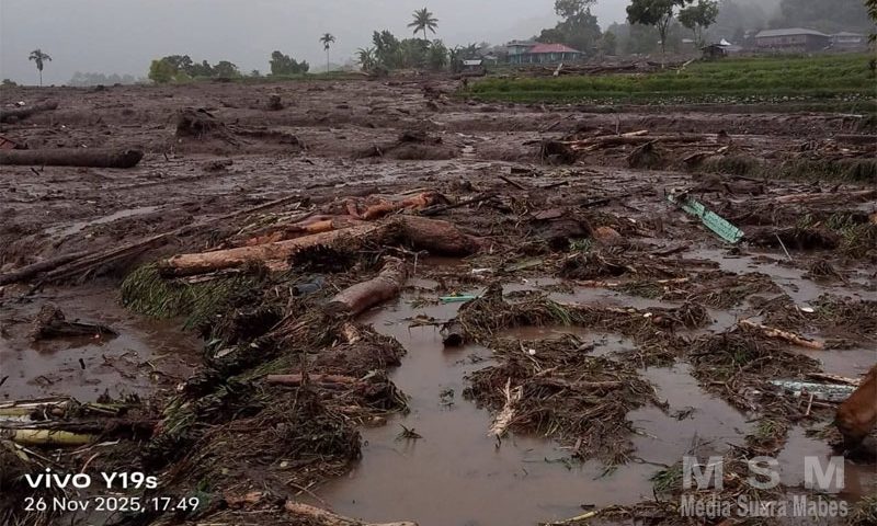 Dalam video berdurasi singkat itu, permukaan tanah berubah menjadi hamparan lumpur pekat, disertai batang pohon dan bongkahan tanah yang terbawa arus dari kawasan hulu.