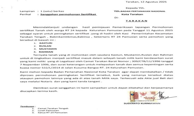 Surat saudara( S), Sanggahan Permohonan Sertifikat Ke BPN Pada tanggal 12 Agustus 2025, Dijawab dari Pihak Badan Pertanahan Nasional (BPN) kota Tarakan, Pada tanggal 14 Agustus 2025, Dengan nomor surat B/HP.01.02/308-65.71/V111/2025 Perihal sanggahan permohonan sertifikat.