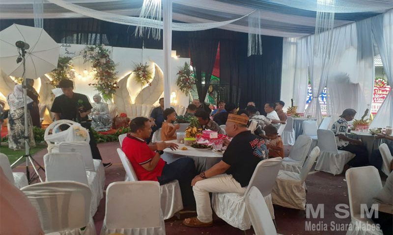 Ratusan tamu undangan yang terdiri dari keluarga, saudara, sahabat, serta warga sekitar turut hadir untuk memberikan doa restu kepada kedua mempelai. Deretan karangan bunga bertuliskan “Happy Wedding” tampak menghiasi area pesta, menambah semarak suasana.